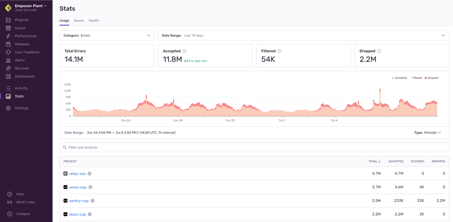 You can look at your events in aggregate in the "Usage Stats" tab of Stats. This information will help you answer key questions about the breakdown of your incoming events or which projects are consuming your quota. The answers to these questions can help you figure out where you need to do further fine-tuning of your SDK filters and configuration.