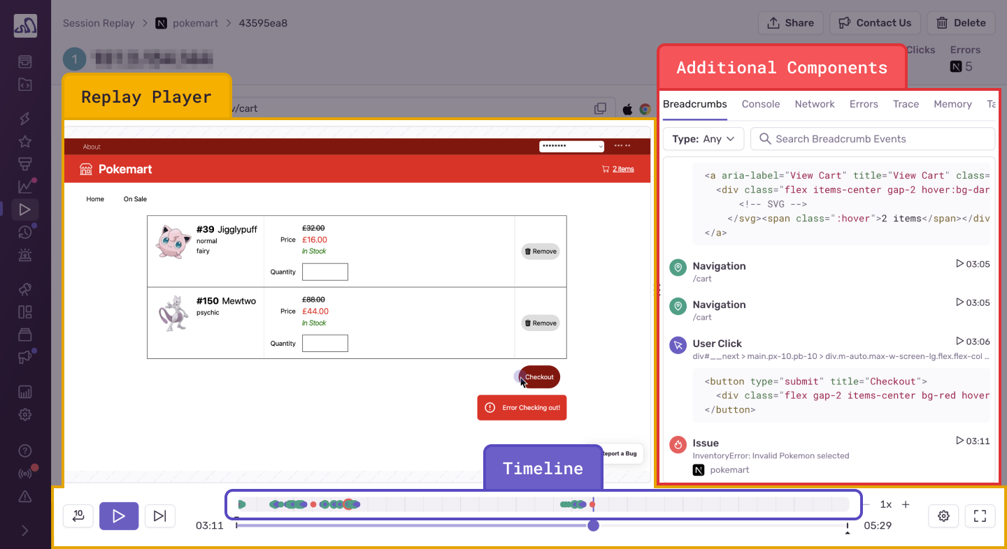 • Breadcrumbs: The replay breadcrumbs show when key user interactions took place, specifically: user clicks (including rage and dead clicks), user inputs, page navigations, page loads, as well as custom breadcrumbs set by the organization and Web Vitals. Web Vitals are augmented with the selector to help users identify which elements are affecting their Web Vital scores. User clicks (including rage and dead clicks), are augmented with surrounding HTML source code to help users understand which event was targeted. These breadcrumbs are synced with the replay player and will auto-scroll as the video plays.