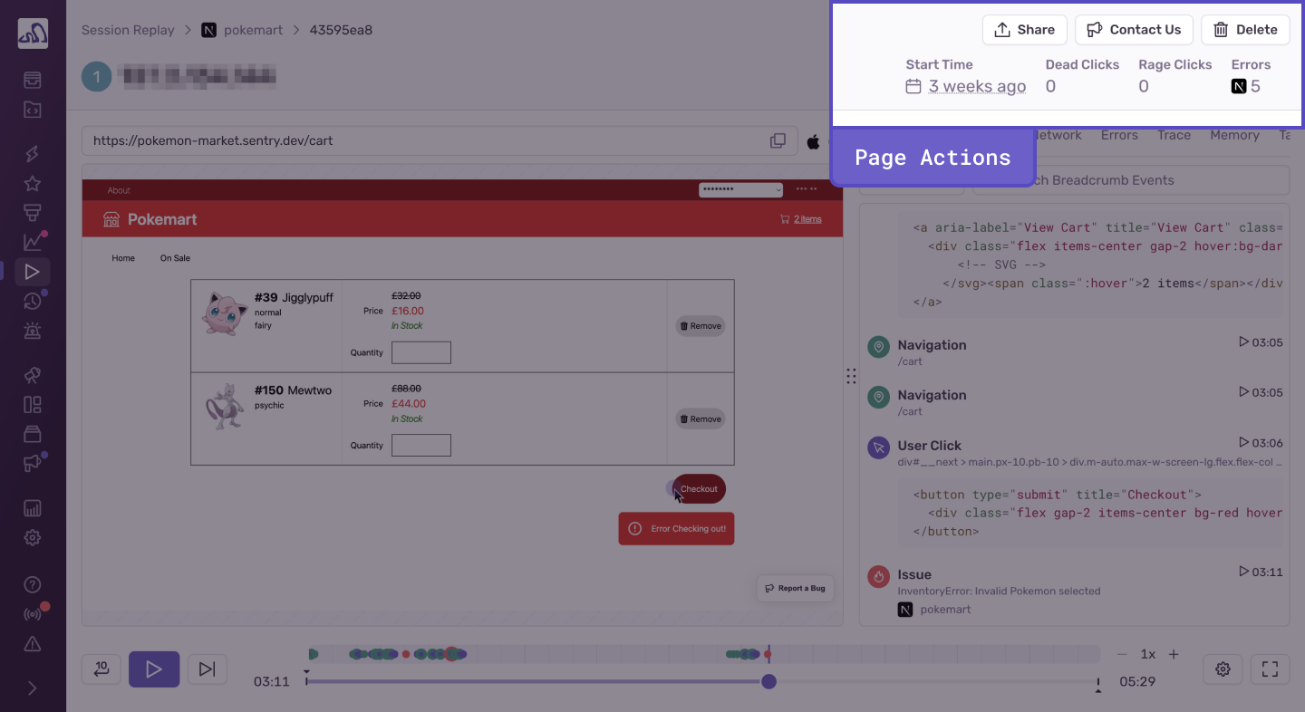 Every replay has a detailed view that contains the embedded video player and rich debugging context. Playing back the video will allow you to see every user interaction in relation to console messages, DOM events, and network requests. It’s like having DevTools active for your production user sessions. Almost every component on this page is connected through timestamps. See the breakdown of each component and why it’s valuable: