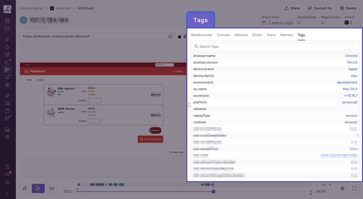 Find a complete list of built-in fields and custom tags associated with a replay under the “Tags” tab next to Breadcrumbs for additional context around the replay you’re viewing.