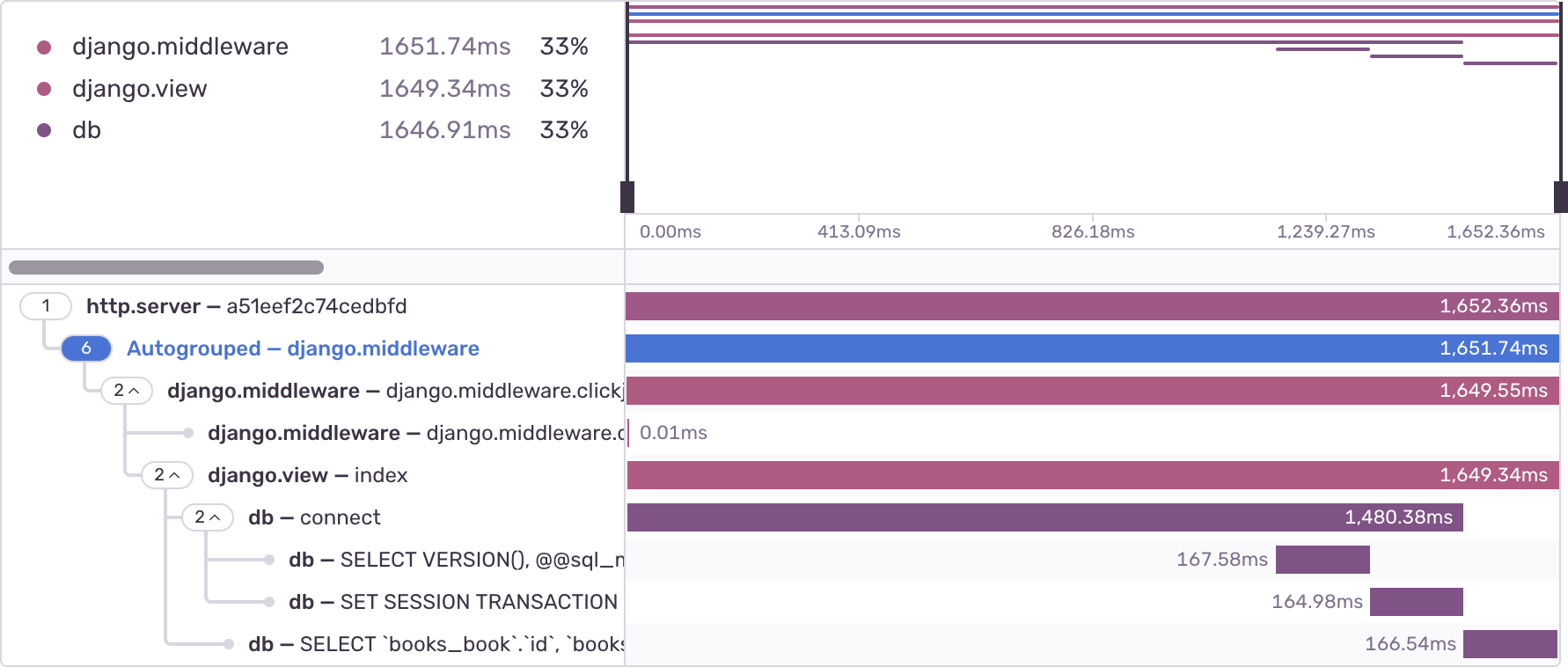 This code has a subtle performance problem. Each call to book.author.name makes a query to fetch the book's author. In total, this code makes 11 queries: one query to fetch the list of books, and 10 more queries to fetch the author of each book. This results in a characteristic query span waterfall: